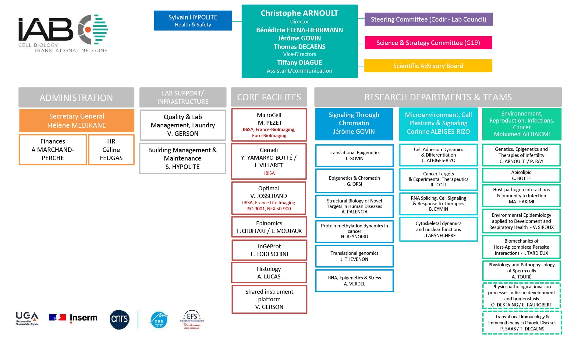 L'IAB est organisé en 3 départements de recherche, soutenus par 5 installations principales (plateformes, services) et une équipe de soutien (finances, administration, logistique, infrastructure).